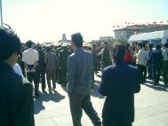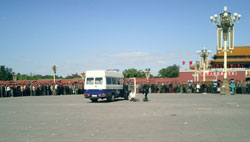 [Minh Huệ] Vào trưa ngày 1 tháng 10 năm 2004 (lễ Quốc khánh Trung quốc), rất nhiều du khách và thường dân đã chứng kiến cảnh công an Trung quốc đánh đập dã man và kéo lôi một đệ tử Pháp Luân Công. Những người có mặt tại quảng trường chỉ trích về hành động đó “Hôm nay, chúng tôi chính mắt thấy sự dã man của công an đối với Pháp Luân Công”.