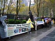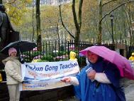 [Minh Huệ] Vào ngày thứ Sáu, 12 tháng 11 năm 2004, trời mưa lớn và gió thổi mạnh tại Manhattan, Nữu ước, và lạnh thấu xương. Tuy nhiên, thời tiết xấu đã không lay chuyển được Chính niệm của các đệ tử Pháp Luân Công. Họ vẫn tiếp tục đi giảng rõ sự thật về Pháp Luân Công và chính sách khủng bố Pháp Luân Công tại Trung Quốc. “Vạn lý Trường thành cùa Sự thật” dưới cơn mưa bão thật lòng làm mọi người xúc động. Nhiều người không thể tưởng tượng nổi những đệ tử Pháp Luân Công là ai và tại sao những đệ tử này rất kiên trì giảng rõ sự thật với một điều kiện khó khăn, khắc nghiệt như thế. Một phụ nữ Hoa kiều đi ngang qua chỗ chúng tôi triển lãm hàng ngày, nói với chúng tôi rằng “Tôi đã đọc qua quyển Chuyển Pháp Luân hai lần rồi. Tôi cảm thấy rằng Pháp Luân Công phải rất là đặc biệt vì có rất nhiều người tu luyện. Vì nó rất cao cả nên có rất nhiều người hết lòng, hết sức yêu cầu thế giới giúp chấm dứt chính sách khủng bố đó”. Một người đàn ông khác đi ngang qua hằng ngày và nói với một đệ tử rằng “Tôi đã bắt đầu tu luyện tại nhà rồi”.