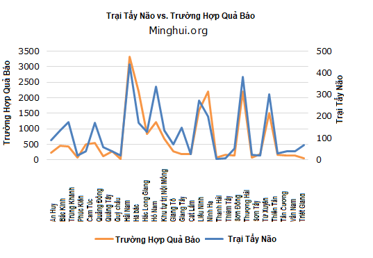 Số trung tâm tẩy não so với số trường hợp bị quả báo (đường màu cam và cột tham chiếu bên trái: số trường hợp bị quả báo; đường màu xanh và cột tham chiếu bên phải: số trung tâm tẩy não)