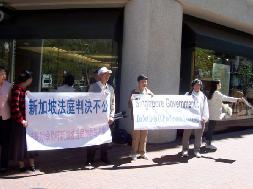 [MINH HUỆ 29-4-2005] Ngày 27-4, toà án Singapore công bố lời tuyên án không đúng đắn và không công bằng chống lại học viên Pháp Luân Công, thu hút sự chú ý từ các học viên Pháp Luân Công nước ngoài. Vào trưa ngày 28 tháng 4 năm 2005, các học viên Pháp Luân Công tại San Francisco thỉnh nguyện ngoài Lãnh sự quán Singapore tại San Francisco, yêu cầu chính phủ Singapore ngay lập tức thả các học viên Pháp Luân Công vô tội. Họ kêu gọi chính phủ Singapore không hành động như kẻ đồng loã với Trung Cộng (ĐCSTQ), và ngay lập tức dừng tham gia cuộc bức hại.