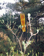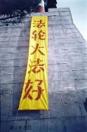Các băng vải Pháp Chính Thiên Địa, Thiện Ác Tất Báo, Pháp Luân Đại Pháp Hảo tại điểm du lịch núi Nghi Mông