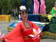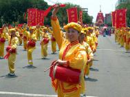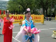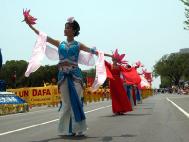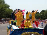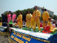 Đoàn diễn hành của các đệ tử Pháp Luân Công bao gồm một xe hoa, và các đệ tử đang biểu diễn công pháp trên đó, một nhóm muá cổ truyền, một nhóm múa trống và một nhóm múa cờ.