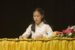 Tiểu đệ tử Thượng Tĩnh Như 15 tuổi kể về trải nghiệm tu luyện khi tham gia Đoàn diễn Thiên quốc. Mặc dù em rất bận và co nhiều bài phải làm, nhưng em vẫn cố gắng làm tốt và thu xếp học Pháp. Em chơi sáo piccolo và em đã học hết bài “Pháp Luân Đại Pháp hảo” và “Mỹ quốc tươi đẹp” chỉ trong nửa ngày. Em trải nghiệm rằng nếu làm công tác Đại Pháp thật tốt thì làm các việc khác cũng tốt.