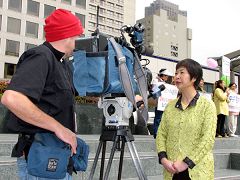 Một phóng viên đài truyền hình phỏng vấn người tham dự