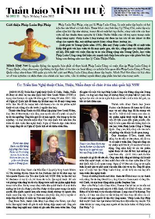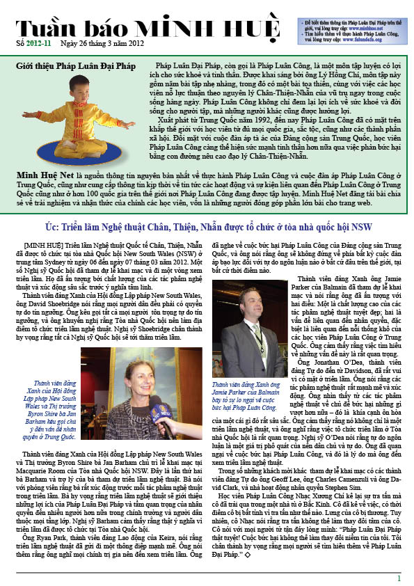 [MINH HUỆ 27-03-2012]Tuần báo Minh Huệ tổng hợp tin tức hàng tuần về cuộc đàn áp ở Trung Quốc và các sự kiện của học viên Pháp Luân Công trên khắp thế giới, với dạng thức là bản in màu định dạng PDF, gồm 4 trang. Bản PDF này định dạng khổ A4 tiện dụng cho việc in ấn phổ thông.