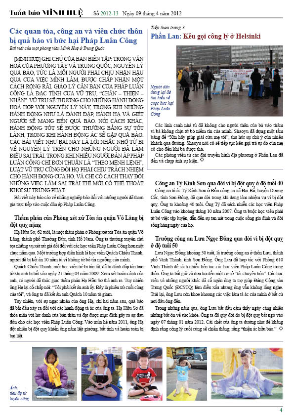 [MINH HUỆ 10-04-2012]Tuần báo Minh Huệ tổng hợp tin tức hàng tuần về cuộc đàn áp ở Trung Quốc và các sự kiện của học viên Pháp Luân Công trên khắp thế giới, với dạng thức là bản in màu định dạng PDF, gồm 4 trang. Bản PDF này định dạng khổ A4 tiện dụng cho việc in ấn phổ thông.