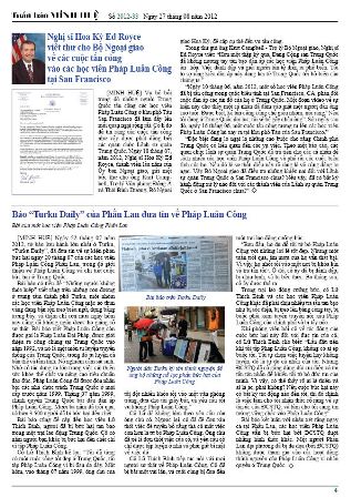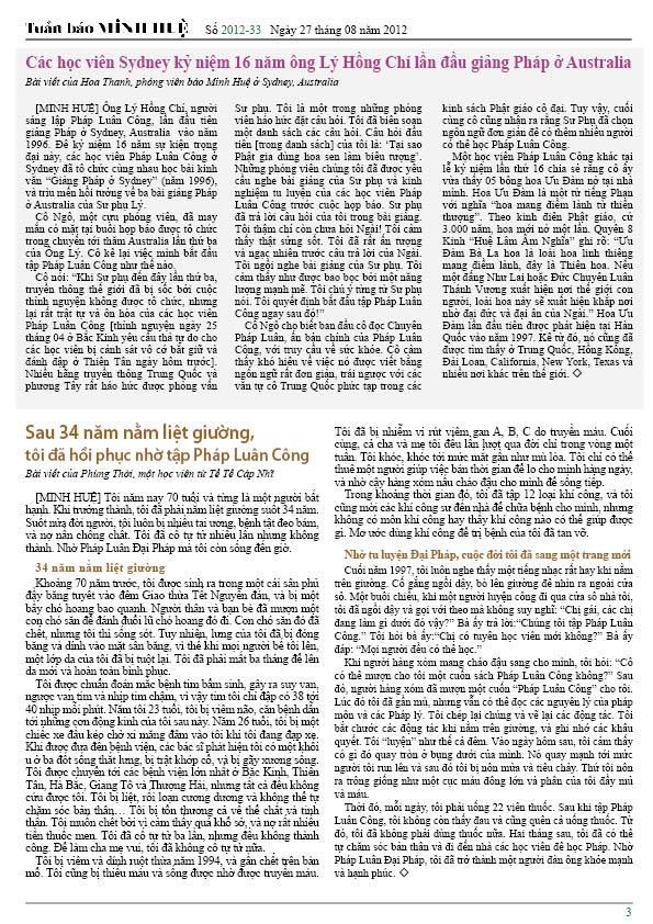 [MINH HUỆ 27-08-2012]Tuần báo Minh Huệ tổng hợp tin tức hàng tuần về cuộc đàn áp ở Trung Quốc và các sự kiện của học viên Pháp Luân Công trên khắp thế giới, với dạng thức là bản in màu định dạng PDF, gồm 4 trang. Bản PDF này định dạng khổ A4 tiện dụng cho việc in ấn phổ thông.