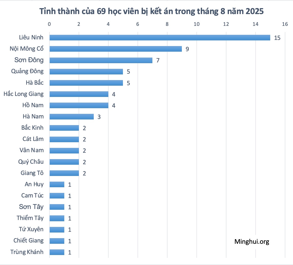 [MINH HUỆ 03-09-2025] Tháng 8 năm 2025 có thêm 69 trường hợp học viên Pháp Luân Công bị kết án tù vì đức tin được báo cáo.