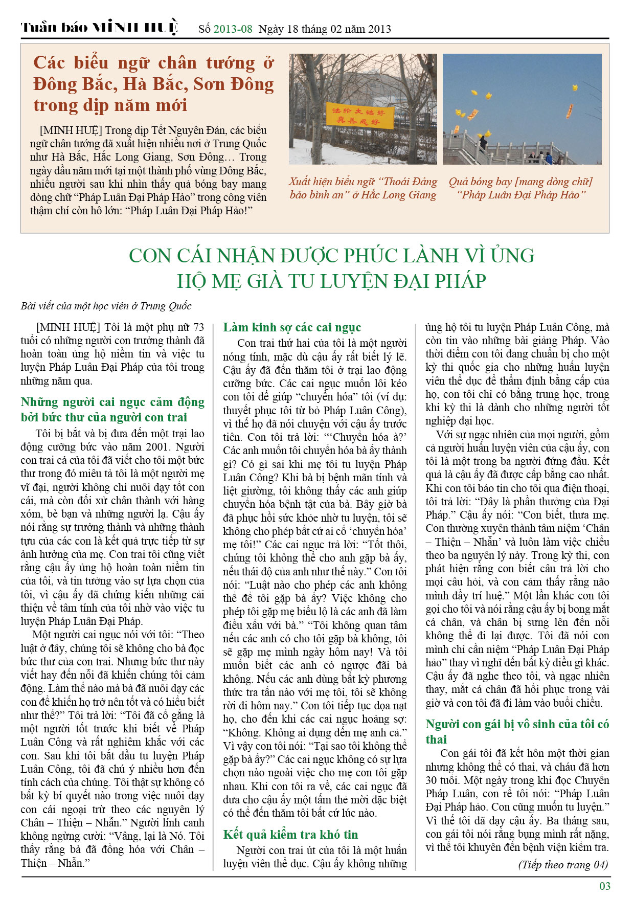 [MINH HUỆ 20-2-2013]Tuần báo Minh Huệ tổng hợp tin tức hàng tuần về cuộc đàn áp ở Trung Quốc và các sự kiện của học viên Pháp Luân Công trên khắp thế giới, với dạng thức là bản in màu định dạng PDF, gồm 4 trang. Bản PDF này định dạng khổ A4 tiện dụng cho việc in ấn phổ thông.