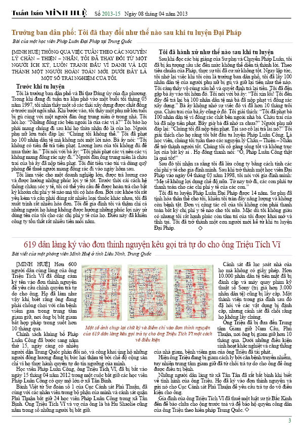 [MINH HUỆ 08-04-2013]Tuần báo Minh Huệ tổng hợp tin tức hàng tuần về cuộc đàn áp ở Trung Quốc và các sự kiện của học viên Pháp Luân Công trên khắp thế giới, với dạng thức là bản in màu định dạng PDF, gồm 4 trang. Bản PDF này định dạng khổ A4 tiện dụng cho việc in ấn phổ thông.