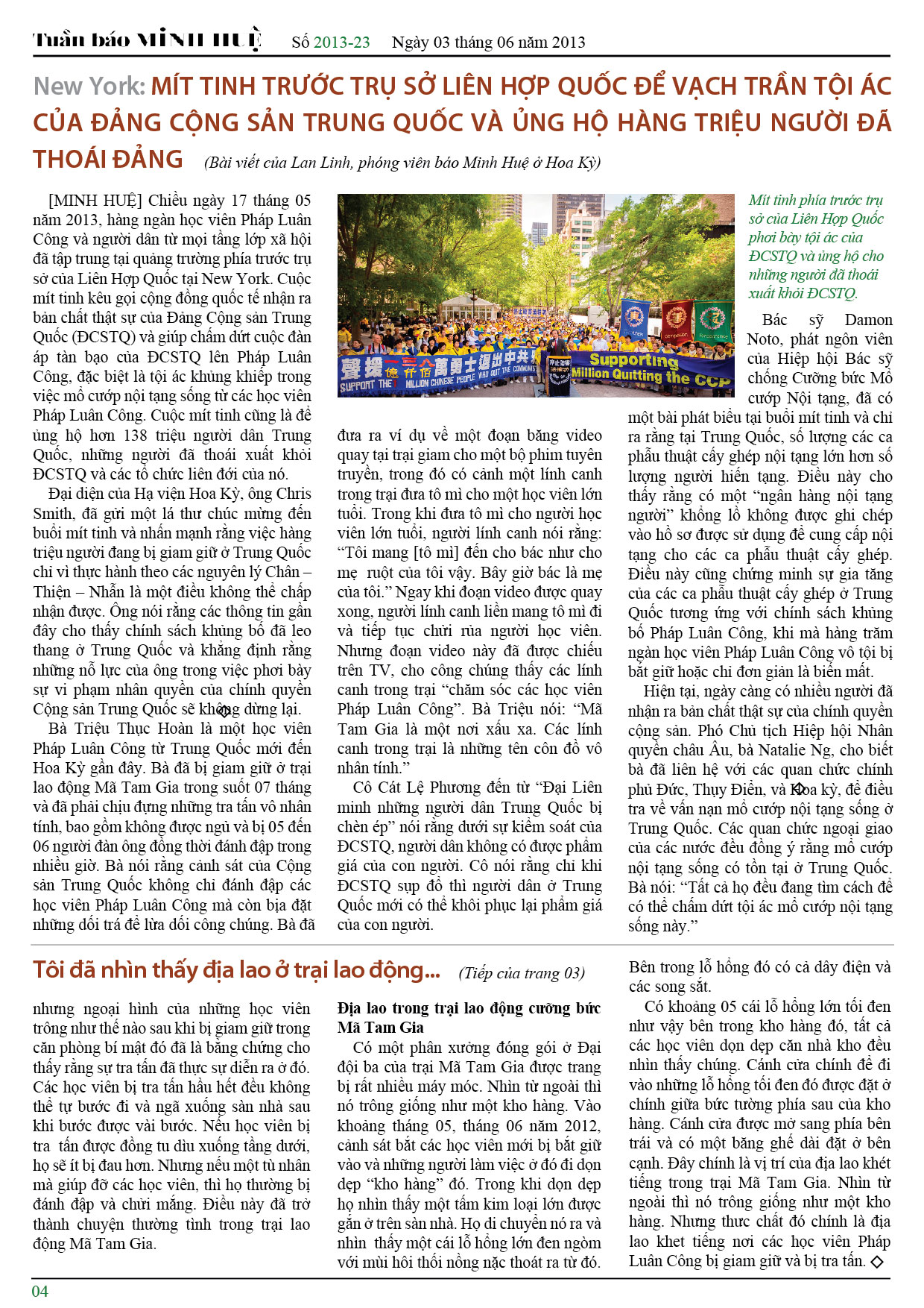 [MINH HUỆ 05-06-2013]Tuần báo Minh Huệ tổng hợp tin tức hàng tuần về cuộc đàn áp ở Trung Quốc và các sự kiện của học viên Pháp Luân Công trên khắp thế giới, với dạng thức là bản in màu định dạng PDF, gồm 4 trang. Bản PDF này định dạng khổ A4 tiện dụng cho việc in ấn phổ thông.