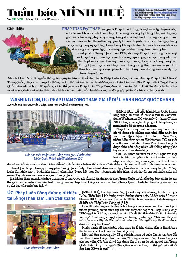 [MINH HUỆ 16-07-2013]Tuần báo Minh Huệ tổng hợp tin tức hàng tuần về cuộc đàn áp ở Trung Quốc và các sự kiện của học viên Pháp Luân Công trên khắp thế giới, với dạng thức là bản in màu định dạng PDF, gồm 4 trang. Bản PDF này định dạng khổ A4 tiện dụng cho việc in ấn phổ thông.