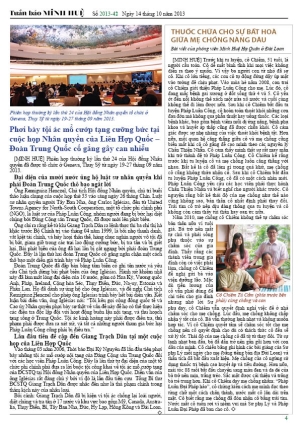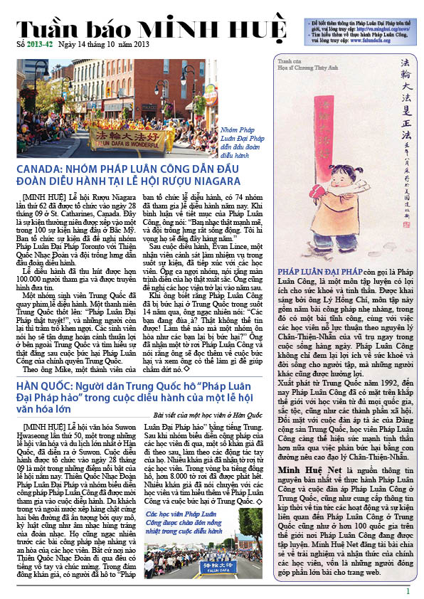[MINH HUỆ 17-10-2013]Tuần báo Minh Huệ tổng hợp tin tức hàng tuần về cuộc đàn áp ở Trung Quốc và các sự kiện của học viên Pháp Luân Công trên khắp thế giới, với dạng thức là bản in màu định dạng PDF, gồm 4 trang. Bản PDF này định dạng khổ A4 tiện dụng cho việc in ấn phổ thông.