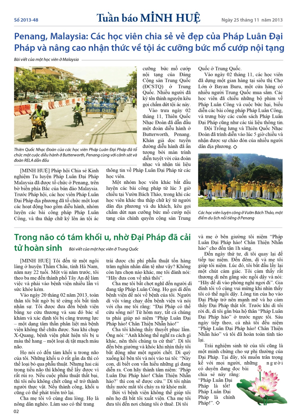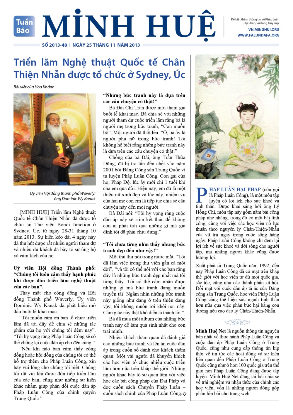 [MINH HUỆ 26-11-2013]Tuần báo Minh Huệ tổng hợp tin tức hàng tuần về cuộc đàn áp ở Trung Quốc và các sự kiện của học viên Pháp Luân Công trên khắp thế giới, với dạng thức là bản in màu định dạng PDF, gồm 4 trang. Bản PDF này định dạng khổ A4 tiện dụng cho việc in ấn phổ thông.