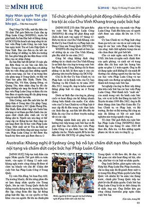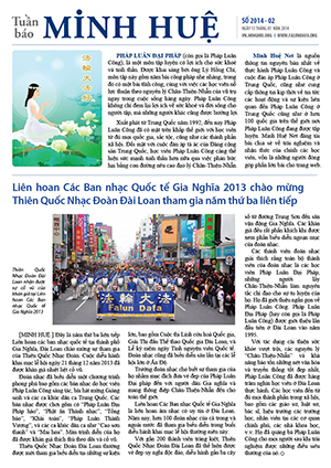 [MINH HUỆ 15-01-2014]Tuần báo Minh Huệ tổng hợp tin tức hàng tuần về cuộc đàn áp ở Trung Quốc và các sự kiện của học viên Pháp Luân Công trên khắp thế giới, với dạng thức là bản in màu định dạng PDF, gồm 4 trang. Bản PDF này định dạng khổ A4 tiện dụng cho việc in ấn phổ thông.