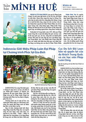 [MINH HUỆ 28-01-2014]Tuần báo Minh Huệ tổng hợp tin tức hàng tuần về cuộc đàn áp ở Trung Quốc và các sự kiện của học viên Pháp Luân Công trên khắp thế giới, với dạng thức là bản in màu định dạng PDF, gồm 4 trang. Bản PDF này định dạng khổ A4 tiện dụng cho việc in ấn phổ thông.
