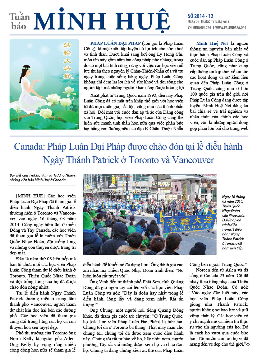 [MINH HUỆ 26-03-2014]Tuần báo Minh Huệ tổng hợp tin tức hàng tuần về cuộc đàn áp ở Trung Quốc và các sự kiện của học viên Pháp Luân Công trên khắp thế giới, với dạng thức là bản in màu định dạng PDF, gồm 4 trang. Bản PDF này định dạng khổ A4 tiện dụng cho việc in ấn phổ thông.