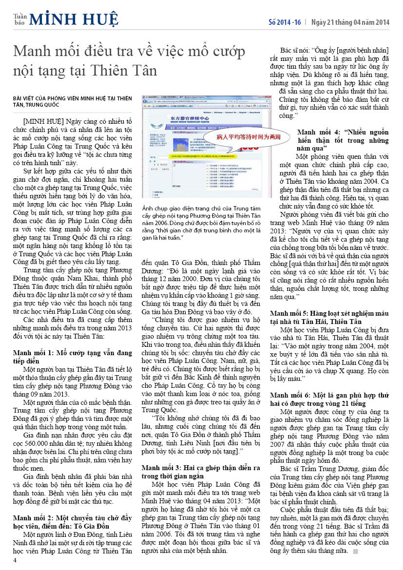 [MINH HUỆ 23-04-2014]Tuần báo Minh Huệ tổng hợp tin tức hàng tuần về cuộc đàn áp ở Trung Quốc và các sự kiện của học viên Pháp Luân Công trên khắp thế giới, với dạng thức là bản in màu định dạng PDF, gồm 4 trang. Bản PDF này định dạng khổ A4 tiện dụng cho việc in ấn phổ thông.