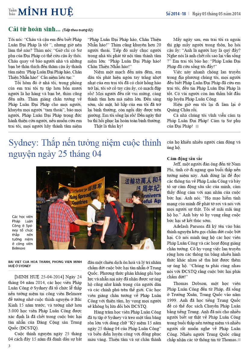 [MINH HUỆ 09-05-2014]Tuần báo Minh Huệ tổng hợp tin tức hàng tuần về cuộc đàn áp ở Trung Quốc và các sự kiện của học viên Pháp Luân Công trên khắp thế giới, với dạng thức là bản in màu định dạng PDF, gồm 4 trang. Bản PDF này định dạng khổ A4 tiện dụng cho việc in ấn phổ thông.