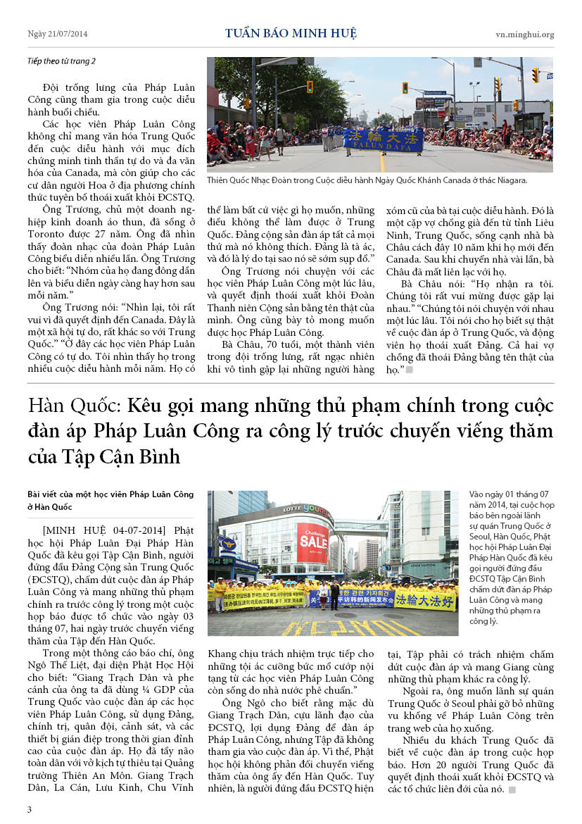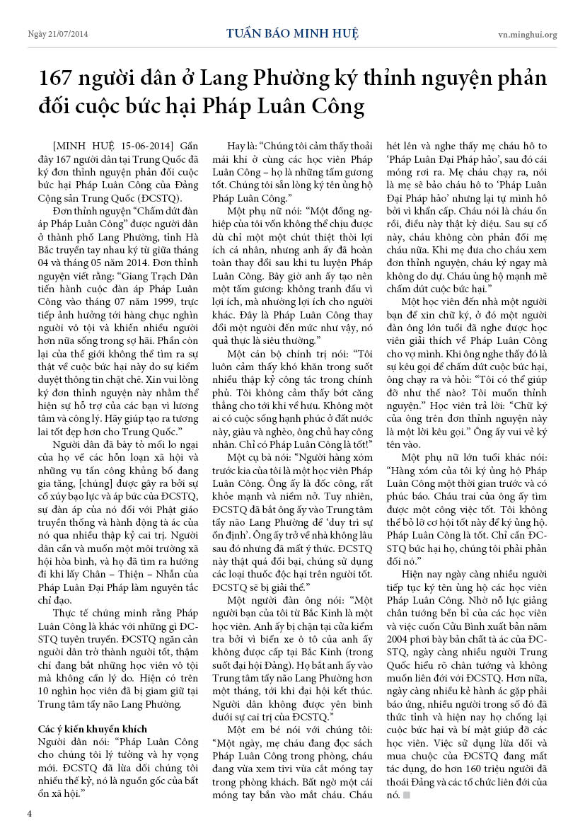 [MINH HUỆ 22-07-2014]Tuần báo Minh Huệ tổng hợp tin tức hàng tuần về cuộc đàn áp ở Trung Quốc và các sự kiện của học viên Pháp Luân Công trên khắp thế giới, với dạng thức là bản in màu định dạng PDF, gồm 4 trang. Bản PDF này định dạng khổ A4 tiện dụng cho việc in ấn phổ thông.