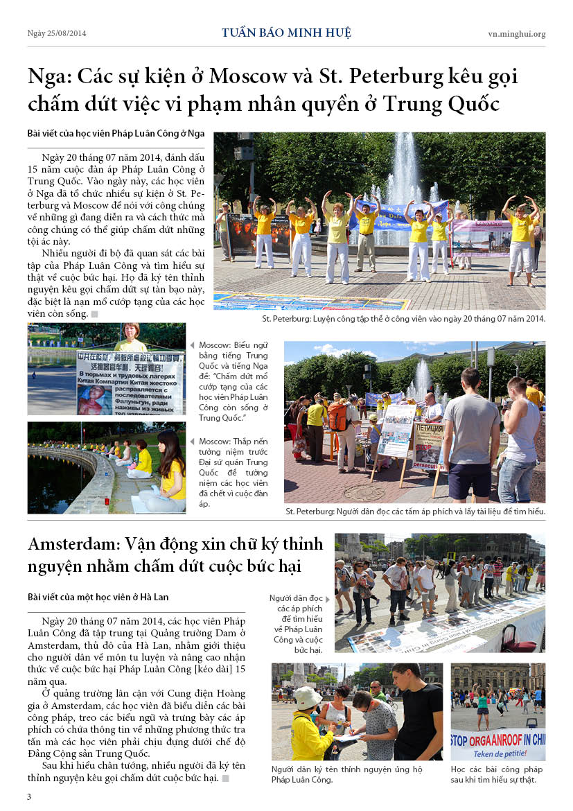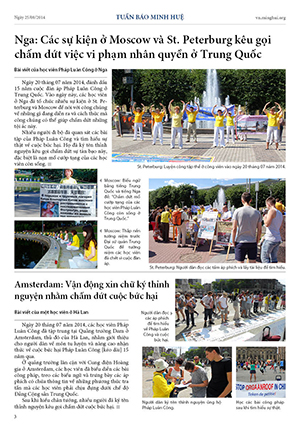 [MINH HUỆ 26-08-2014]Tuần báo Minh Huệ tổng hợp tin tức hàng tuần về cuộc đàn áp ở Trung Quốc và các sự kiện của học viên Pháp Luân Công trên khắp thế giới, với dạng thức là bản in màu định dạng PDF, gồm 4 trang. Bản PDF này định dạng khổ A4 tiện dụng cho việc in ấn phổ thông.