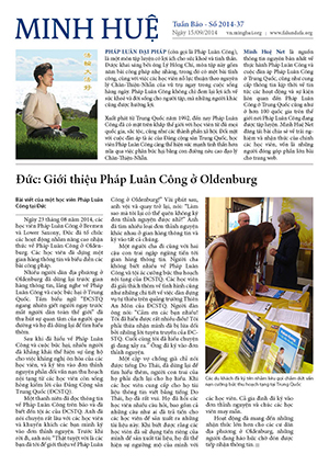[MINH HUỆ 15-09-2014]Tuần báo Minh Huệ tổng hợp tin tức hàng tuần về cuộc đàn áp ở Trung Quốc và các sự kiện của học viên Pháp Luân Công trên khắp thế giới, với dạng thức là bản in màu định dạng PDF, gồm 4 trang. Bản PDF này định dạng khổ A4 tiện dụng cho việc in ấn phổ thông.