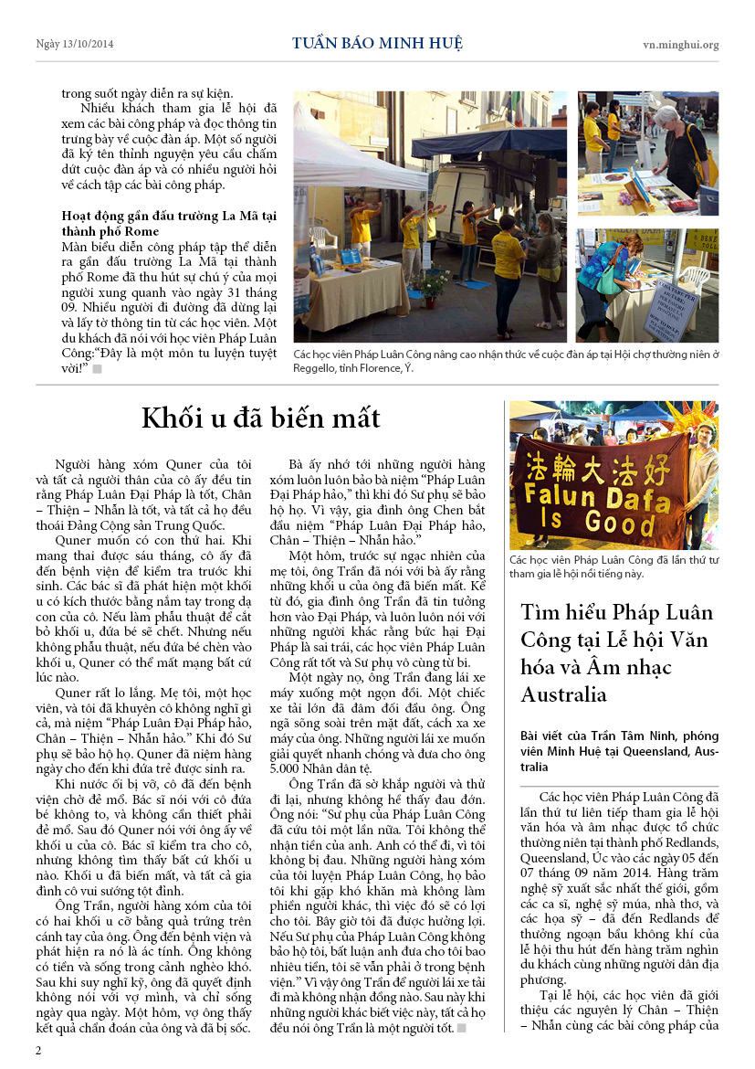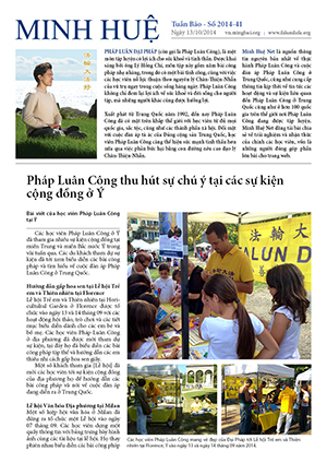 [MINH HUỆ 14-10-2014]Tuần báo Minh Huệ tổng hợp tin tức hàng tuần về cuộc đàn áp ở Trung Quốc và các sự kiện của học viên Pháp Luân Công trên khắp thế giới, với dạng thức là bản in màu định dạng PDF, gồm 4 trang. Bản PDF này định dạng khổ A4 tiện dụng cho việc in ấn phổ thông.