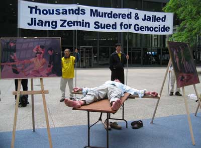 Tiến sĩ Terri Marsh, luật sư trưởng đại diện cho những người tập Pháp Luân Công trong một vụ kiện tập thể buộc tội cựu lãnh đạo Trung quốc Giang Trạch Dân vì đã phạm tội ác tra tấn và diệt chủng, nói tại cuộc họp báo tại Federal Plaza, “Ngày 27 thang 5 năm 2004, Tòa phúc thẩm Hợp chủng quốc Hoa kỳ cho lần điều tra thứ 7 sẽ phán xử xem liệu những cựu nguyên thủ quốc gia của nhưng nước khác có thể dùng lời biện hộ “nguyên thủ quốc gia”, thường chỉ được dùng giới hạn cho những nguyên thủ quốc gia đang đương nhiệm, để bảo vệ mình khỏi phải chịu trách nhiệm công dân đối với những lời buộc tội về tội ác tra tấn, diệt chủng và tội ác chống lại loài người hay không. Để làm như vậy trên thực tế phải hủy bỏ khuôn khổ được thiết lập bởi những xét xử Nuremberg, những hiệp ước quốc tế và những công cụ được đặt ra có liên quan đến nó, và hủy bỏ tất cả những cản trở được tạo ra.” “Đây là một thời khắc quyết định trong lịch sử nước Mỹ. Chúng ta có một cơ hội để đặt chúng ta sang bên chính diện của lịch sử. Có hy vọng rằng chúng ta sẽ đứng lên đối mặt với thử thách đó.”