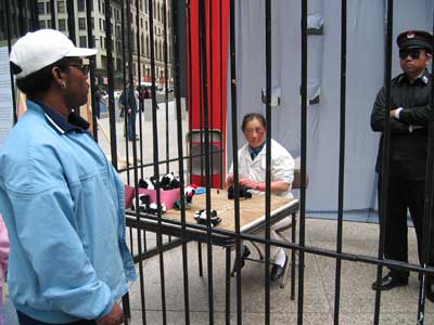 [Chính Kiến] Ngày 24 tháng 5 năm 2004, những người tập Pháp Luân Công đã tổ chức triển lãm ảnh và dựng lại cảnh tra tấn với tiêu đề “Đàn áp vấp phải những nguyên tắc đạo đức” tại Federal Plaza ở trung tâm thương mại Chicago để cho mọi người thấy những cách tra tấn tàn bạo đối với những người tập Pháp Luân Công ở Trung quốc.