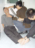 Những tên công an đè người đệ tử xuống nền nhà, dùng ba tông để đánh và xương cằm, rất đau đớn.