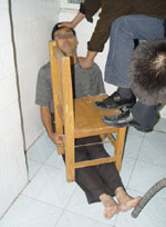 Trại giam Haidian Detention đè người đệ tử vào trong góc tường, đặt một cái ghế lên trên hai chân, và mấy tên công an đứng trên ghế đó và nắm giữ đầu anh đệ tử, sau đó có một tên công an dùng ba tông để đánh vào lòng bàn chân của anh ta.