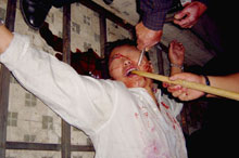 Hoạt cảnh những phương pháp tra tấn mà các đệ tử tại Trung quốc gánh chịu: Trùm đầu bằng bao ny lông, còng chặt vào giường sắt và những phương pháp khác