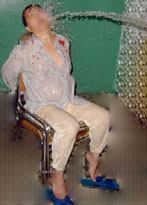 Tại Daqing Honggang Detention Center, trại trưởng Wang ép mấy tên tù nhân lột hết áo quần người đệ tử, cạo đầu, khoá họ vào ghế sắt, và sau đó dùng ống nước xịt cao áp suất, xịt vào miệng người đệ tử. Các đệ tử phải ngậm răng thật chặt, và thường là không thở được. Vì khi họ thở, nước sẽ theo vào phổi và bao tử. Máy nước nào tiếp tục xịt như thế từ bên này sang bên khác. Xịt trong 20 phút như thế thì bao tử của người đệ tử đầy cả nước và miệng chảy máu rất nhiều.