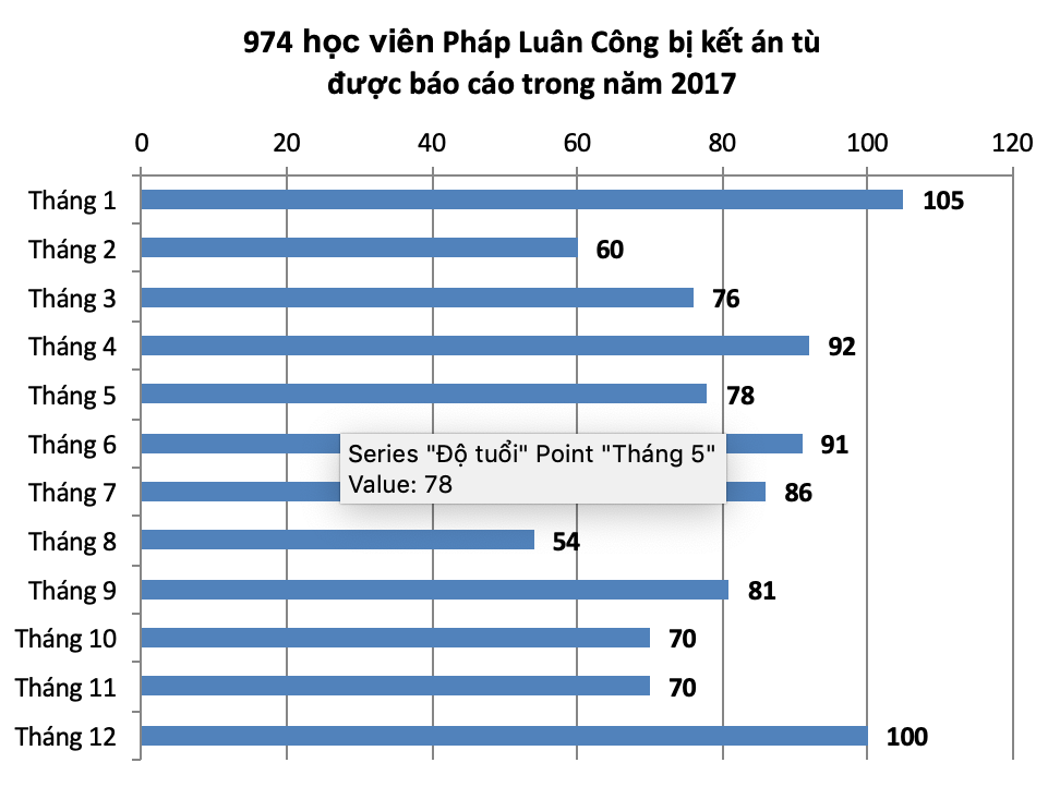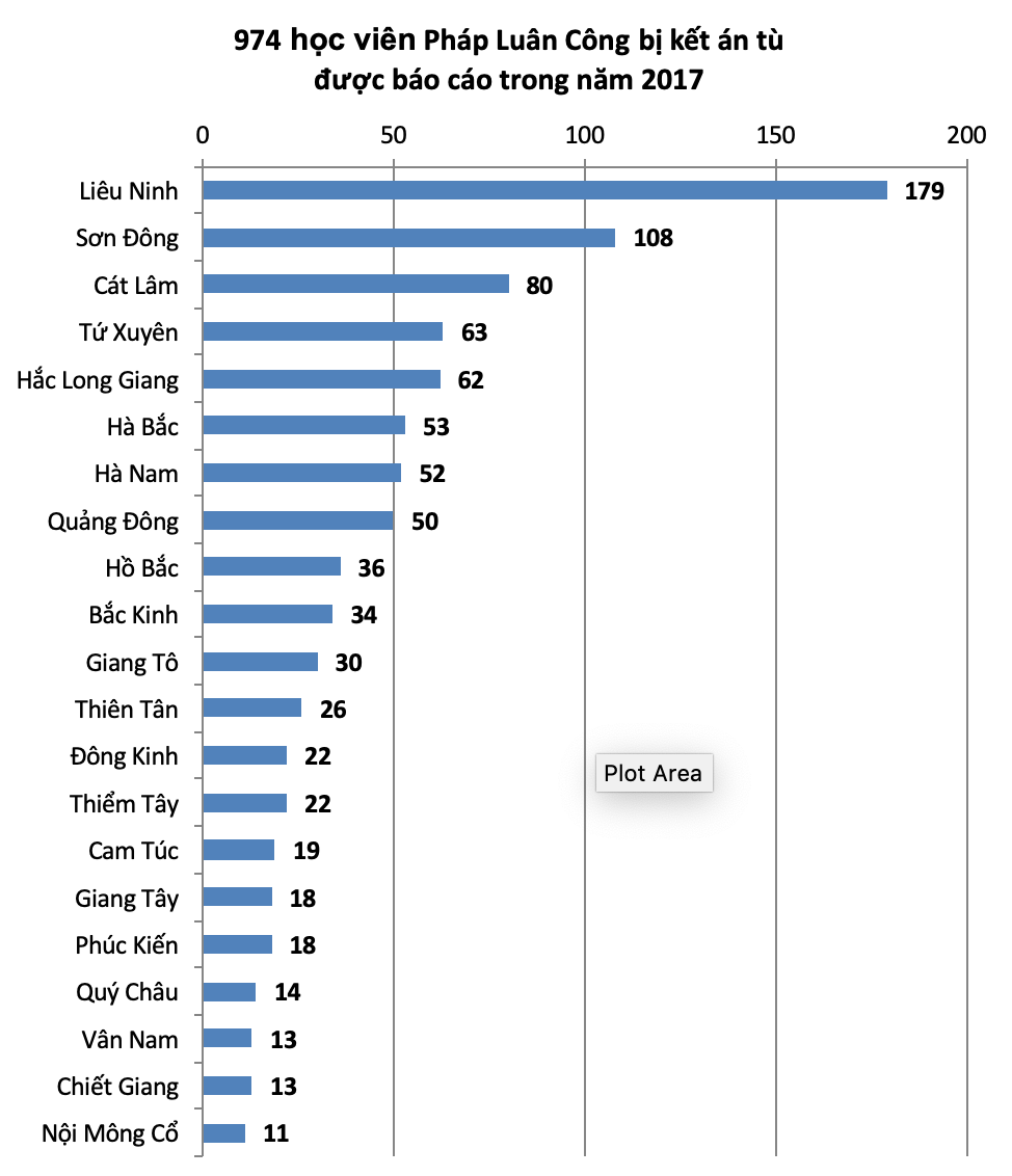 Với 874 bản án của các học viên Pháp Luân Công được báo cáo trong 11 tháng đầu của năm 2017, con số này đã đưa tổng số học viên bị kết án lên 974 trường hợp.