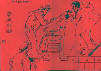 Hình hoạ 2: Mục đích của “Cưỡng bức ăn uống” không phải là để nuôi thân thể, nhưng mà để tra tấn làm cho nạn nhân đau đớn hơn để cho các đệ tử ký vào giấy ly khai Pháp Luân Công (tờ giấy bằng Hoa ngữ trên bàn)