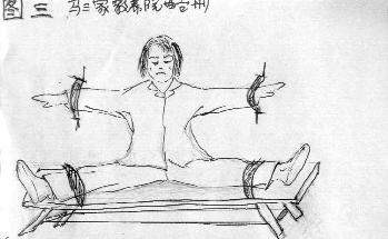 Phương pháp 3: Trói các đệ tử theo chữ “土” (chữ thổ): Phương pháp này, hai tay của các đệ tử bị trói vào tường và hai chân bị trói dọc theo cái ghế để thành chữ “土” (chữ thổ). Phương pháp này gây nên đau đớn toàn thân và tâm của người đệ tử.