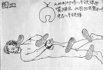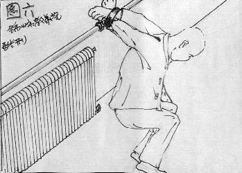 Phương pháp 9: Giơ chân lên càng cao càng tốt và còng vào thanh sắt của cửa sổ. Trong khi đó, căng chân kia thẳng lên và còng hai tay ra sau lưng. Tra tấn cách này cũng được dùng cho các đệ tử lớn tuối (60s) trong một thời gian rất dài.