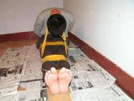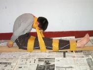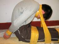 Các tên cai ngục tại các trại cưỡng bức lao động trói các đệ tử Pháp Luân Công vào một cái thang, bắt họ “ngồi dọc theo cái thang” trong một thời gian rất dài. Không có được cái thang, chúng tôi dùng ván để diễn tả cho các bạn thấy. Miệng của các đệ tử bị dán rất chặt để không cho kêu thét. Tay của các đệ tử bị trói chặt ra đàng sau lưng và dùng dây băng để trói đầu và kéo dài xuống ngực.
